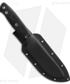 The handle uses black canvas micarta. Black Canvas micarta not only looks good but it also provides a very good gripping surface as well as being impervious to heat, cold, oil, water and other things that would destroy most handle materials. The sheath is made from black Kydex and features a belt clip, and black eyelets so you can lash the sheath to your gear if that is your desire.