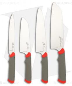 The four essential blades for the home cook includes a 7″ Santuko, 6-3/4″ Chef knife, 5-1/4″ Santuko and 6″ Utility knife. The blade are full flat ground German DIN 1.4116 stainless steel (hardened to 55-757 RC) while the handles are soft Santoprene rubber for no-slip grip and easy cleaning. Although these knives can be put through the dishwasher, Ethan recommends hand-washing these fine knives.
