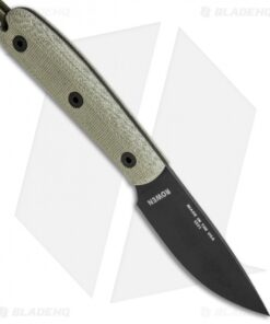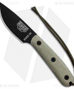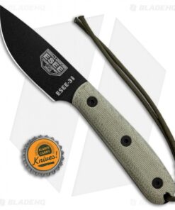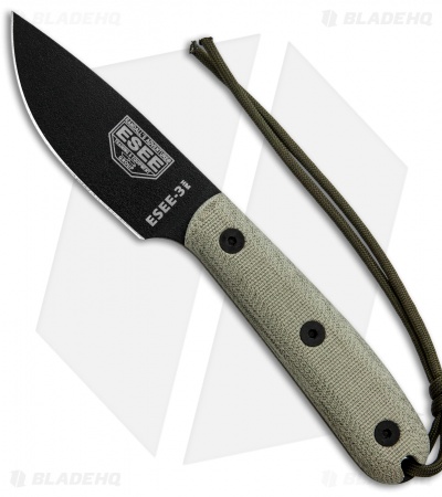The ESEE-3HM fixed blade knife features a black finished 1095 steel blade with a plain cutting edge, canvas Micarta scales and a traditional handle design with a smooth rounded pommel. This ESEE model includes a leather sheath with a belt loop.