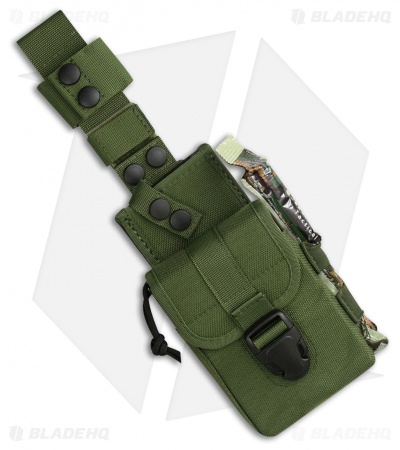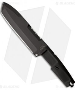 The quarter inch thick Bohler N690 stainless steel modified tanto blade shape can chop, hack, slice and saw. The long blade easily tackles large tasks while the integrated spine serrations gives you the versatility of having serrations without sacrificing blade length. Black Forprene handles are comfortable in hand allows for serious use without fatigue. The MOLLE compatible sheath allows for a variety of carry options and includes an extensive survival kit.