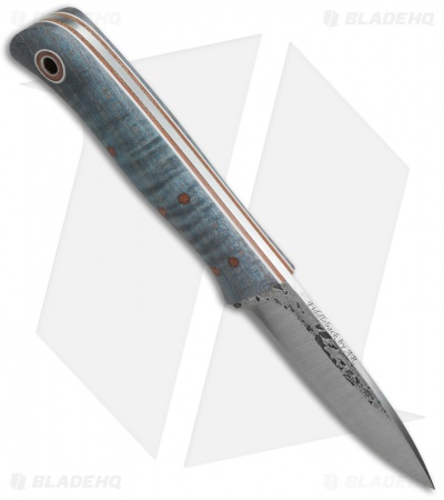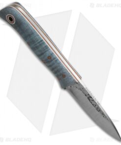 The Hiking Buddy is designed to offer a support role in bushcrafting, taking the place of a large folder while upping the reliability factor. It’s the knife you’ll turn to most. This model features a dyed curly maple wood handle with natural Micarta liners and white stripes. The 1/8″ thick O1 steel blade has a straight full tang. Sheath not included.