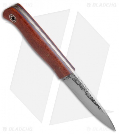 The KE Bushie fixed blade is a spear point bushcrafting knife with a look and feel that comes standard on Fiddleback Forge knives. This model features a bloodwood handle with natural Micarta and blue G-10 liners. Its blade is made from convex ground A2 steel. Fiddleback Forge fixed blades are a real treat for those looking to acquire a premium handmade knife with an emphasis on comfort in hand, efficient blade dynamics, and a traditional style.