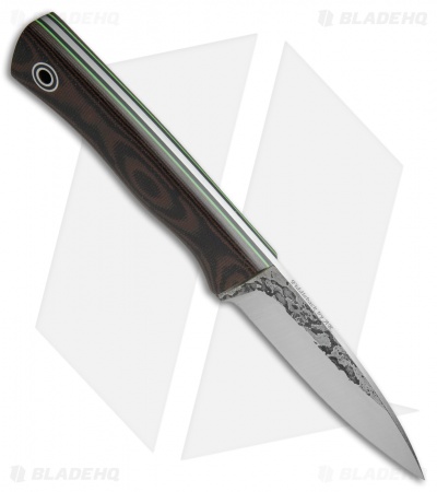 The Kephart fixed blade is based on the popular American knife pattern used by Horace Kephart, an early 20th century outdoorsman. Fiddleback Forge has added some great curves to the knife while maintaining the traditional spear point blade profile. This Kephart has a black/brown canvas Micarta handle with black G-10 liners and lime green pinstripes. The full-tang blade is A2 steel with a satin finish. Sheath not included.