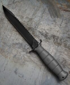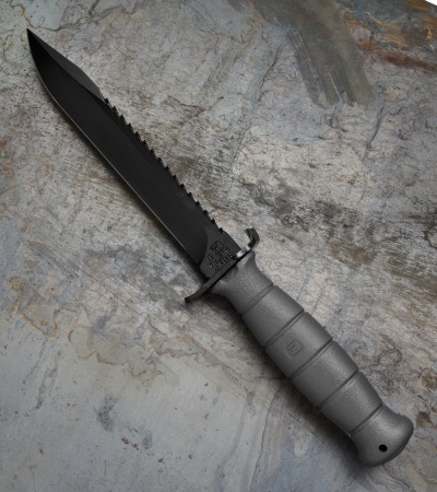 The Glock Field Fixed Blade Knife is the perfect addition to any tool kit, field pack or belt. The Glock Field Knife features a tough full tang carbon steel clip point blade with a integrated saw on its upper edge and a molded polymer hilt. This Field knife is tough enough to handle any task, and perfectly balanced for hand-to-hand combat. The blade is phosphate treated and coated to prevent corrosion to give you the endurance and dependability you rely on from Glock. Comes with a one-piece polymer sheath that keeps your knife secure during times of extreme activity. This model has a gray polymer handle and a matching gray sheath.