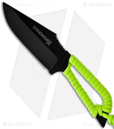 The Eclipse from Grindworx is a finely crafted knife from Southwest Asia. It features a black coated stainless steel blade with a notched thumb ramp spine. The Eclipse has a venom green paracord wrapped handle with lanyard hole.