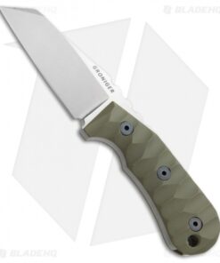 This custom fixed blade from Groniger Knives is a beast of knife that remains compact enough for comfortable everyday carry. Full tang construction, with a quarter inch thick blade provides a solid platform for any utility cutting chore. A custom, handmade build ensures the highest level of quality for all Groniger knives. This model is outfitted with carved OD green G-10 scales and a stonewashed CPM S30V blade in a reverse tanto style.