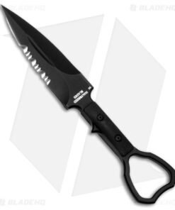 - Black Teflon-coated single-edged dagger blade made from D2 steel with partial serrations.