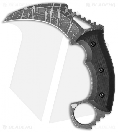 With an eye for and understanding of proper karambit function, HavocWorks created a knife for the trained professional. This KAOS-BIT Karambit has a pattern acid etched blade and black G-10 scales. The full-tang blade is beveled, providing additional tactility in hand to complement the 1.05″ diameter finger ring. The blade on the KAOS-BIT has a sharpened upper edge in addition to the primary cutting edge. Includes a fitted Kydex sheath, Tek-Lok belt attachment sold separately.