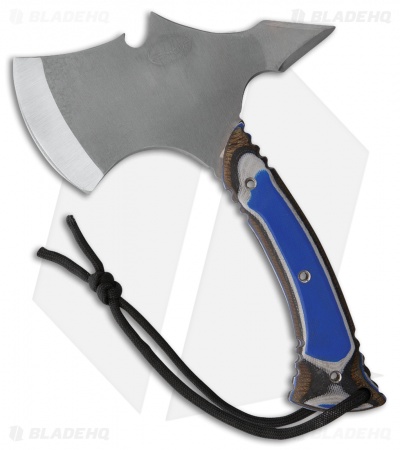 The Hazen Knives Squatch Hatchet with blue, black and gray G-wood handle and 1095 steel blade, the small hatchet is great for detailed cutting and chopping tasks.