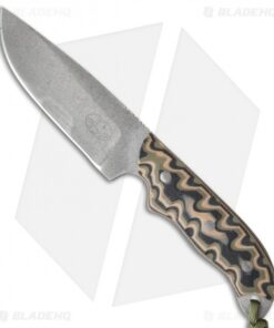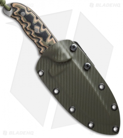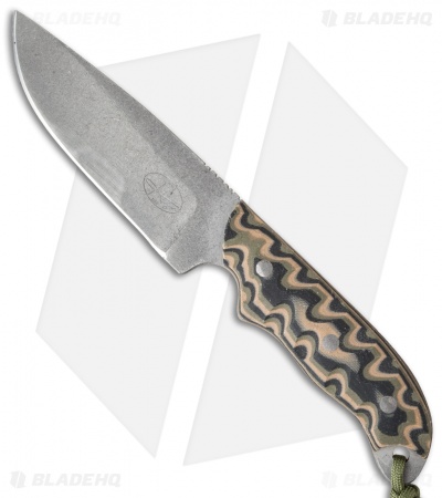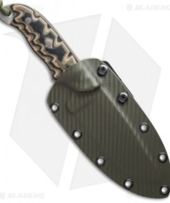 This Large Model fixed blade is an extremely fine handcrafted knife that’s outfitted with scalloped camo (black/green/coyote) G-10 scales. The grip and feel in hand are impressive, as is the overall look and design. Includes a Kydex sheath with belt clip.