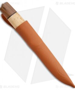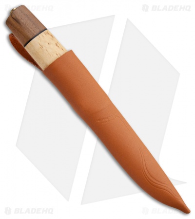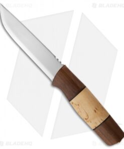 The Brakkar is one of the biggest Helle knives around. It features a handle assembly of walnut and curly birch with leather spacers. The blade is their triple laminated stainless steel with the traditional scandi grind. Includes a deep, sturdy leather sheath in the Nordic style.