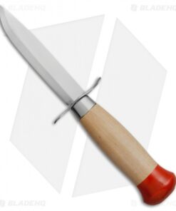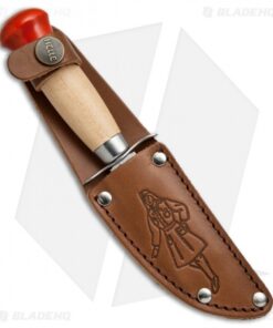 This knife sports a wood handle with red painted cap and a steel guard for safety. The blade is quality stainless steel with a scandi grind. Item includes a brown leather sheath for comfortable everyday carry.