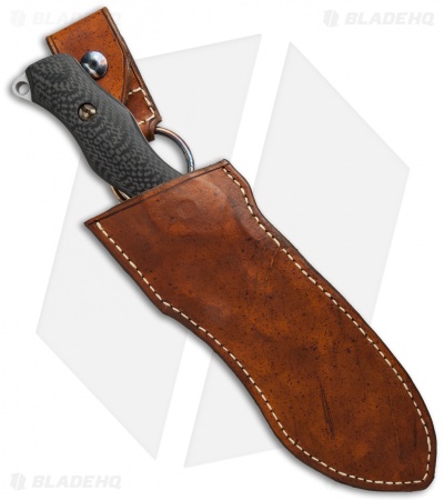 This custom Seraphim fixed blade exhibits an impressive recurved blade with a high polish finish. The blade was hand ground and is marked with the maker, model, and serial number on the spine. Thick carbon fiber scales are fastened to the handle with bronzed hardware. Complete with a custom leather sheath, this Seraphim knife is an exceptional piece.