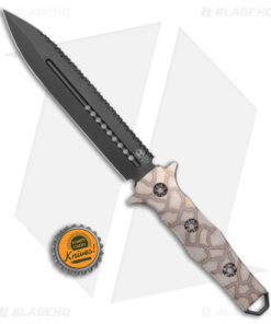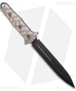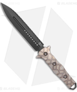 - Black finely serrated dagger blade made from ELMAX super steel.