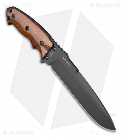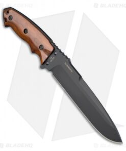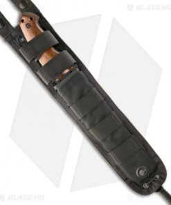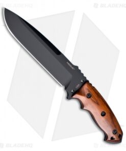 The EX-F01 knife is tough, with a 1/4″ thick A2 tool steel blade this tactical fixed blade isn’t the type to let you down. The 7″ KG Gun-Kote finished drop point blade is full tang with an extended breaker at the base. The shape and contour of the handle offers extreme comfort and grip with the index groove below and spine notches up top. The Cocobolo wood scales are beautiful and supremely contoured for a grip that you’d expect from Hogue. The EX-F01 includes a black ballistic nylon sheath with a MOLLE compatible back.