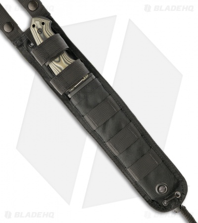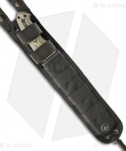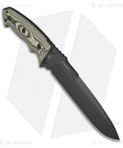 The EX-F01 knife is tough, with a 1/4″ thick A2 tool steel blade this tactical fixed blade isn’t the type to let you down. The 7″ KG Gun-Kote finished drop point blade is full tang with an extended breaker at the base. The shape and contour of the handle offers extreme comfort and grip with the index groove below and spine notches up top. The green G-10 handle scales feature a stylish “G-Mascus” pattern. Securely tucked on the front side of the handle is a Torx wrench so you can remove the scales, revealing a little storage inside. The EX-F01 includes a black Milspec ballistic nylon sheath with a MOLLE compatible back.