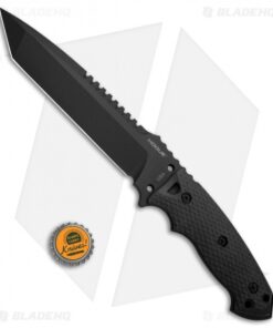 The EX-F01 knife is tough, with a 1/4″ thick A2 tool steel blade this tactical fixed blade isn’t the type to let you down. The 7″ blade is full tang with an extended striker at the base. The shape and contour of the handle offers extreme comfort and grip with the index groove below and spine notches up top. The G-10 handle scales feature a textured pattern for a high performance grip. The EX-F01 includes a black Milspec ballistic nylon sheath with a MOLLE compatible back.