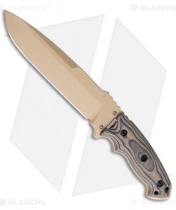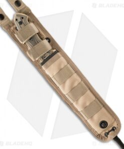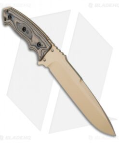 The EX-F01 knife is tough, with a 1/4″ thick A2 tool steel blade this tactical fixed blade isn’t the type to let you down. The 7″ KG Gun-Kote finished drop point blade is full tang with an extended breaker at the base. The shape and contour of the handle offers extreme comfort and grip with the index groove below and spine notches up top. The tan G-10 handle scales feature a stylish “G-Mascus” pattern. Securely tucked on the front side of the handle is a Torx wrench so you can remove the scales, revealing a little storage inside. The EX-F01 includes a ballistic nylon sheath with a MOLLE compatible back.