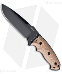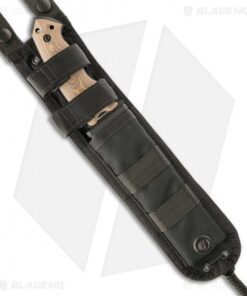 The EX-F01 knife is tough, with a 1/4″ thick A2 tool steel blade this tactical fixed blade isn’t the type to let you down. The 5.5″ KG Gun-Kote finished drop point blade is full tang with an extended breaker at the base. The shape and contour of the handle offers extreme comfort and grip with the index groove below and spine notches up top. The tan G-10 handle scales feature a stylish “G-Mascus” pattern. Securely tucked on the front side of the handle is a Torx wrench so you can remove the scales, revealing a little storage inside. The EX-F01 includes a black Milspec ballistic nylon sheath with a MOLLE compatible back.