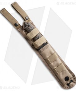 The EX-F01 knife is tough, with a 1/4″ thick A2 tool steel blade this tactical fixed blade isn’t the type to let you down. The 5.5″ KG Gun-Kote finished drop point blade is full tang with an extended breaker at the base. The shape and contour of the handle offers extreme comfort and grip with the index groove below and spine notches up top. The tan G-10 handle scales feature a stylish “G-Mascus” pattern. Securely tucked on the front side of the handle is a Torx wrench so you can remove the scales, revealing a little storage inside. The EX-F01 includes a ballistic nylon sheath with a MOLLE compatible back.