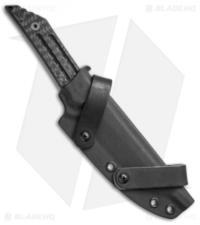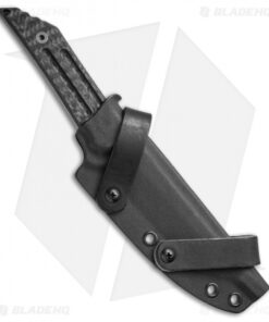 This Kwaiback fixed blade from Jake Hoback Knives features a full-tang CPM-S35VN blade with a Black Fallout finish. The handle is fitted with carbon fiber scales that add a classy modern look to a time-honored design. Its upswept, Samurai sword inspired blade efficiently cuts and slices through obstacles with ease. The Kwaiback fixed blade can be carried comfortably on your belt without weighing you down. Includes a specially designed Kydex sheath for secure belt carry.