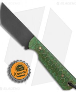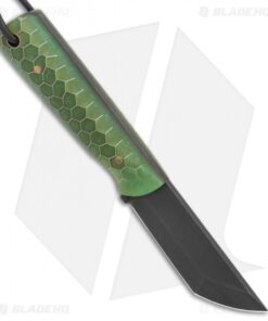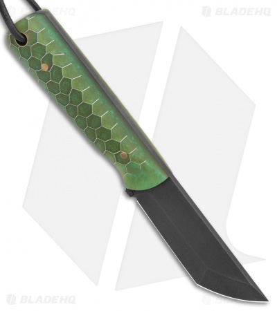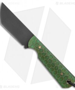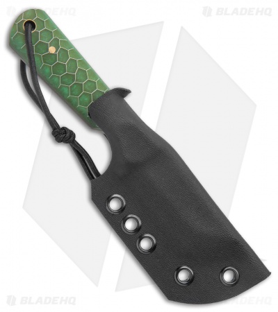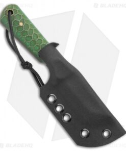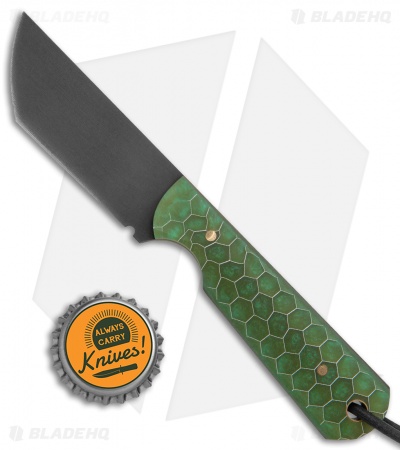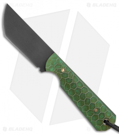 - Green resin honeycomb handle scales over a full tang with brass pins.