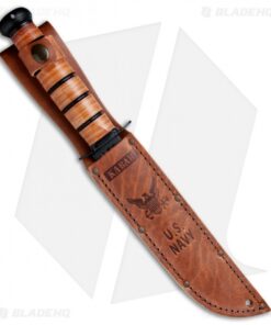 Since the 1940’s, the Ka-Bar US Navy fixed blade knife has been a trusted companion for Soldiers, Marines and Seamen alike. Now with the tradition that more than half a century brings, this knife has been updated with modern tooling and construction. It comes equipped with the iconic clip point blade, made from expertly ground and heat treated 1095 Cro-Van steel. The stacked leather handles are bonded together and contoured into the familiar oval shape for excellent comfort, traction, and control. Item includes a powered steel guard and pommel, and a brown embossed leather sheath.