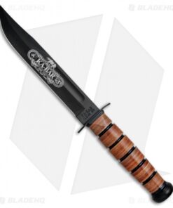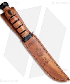Since the 1940’s, the Ka-Bar US Army fixed blade knife has been a trusted companion for Soldiers, Marines and Seamen alike. Now with the tradition that more than half a century brings, this knife has been updated with modern tooling and construction. It comes equipped with the iconic clip point blade, made from expertly ground and heat treated 1095 Cro-Van steel. The stacked leather handles are bonded together and contoured into the familiar oval shape for excellent comfort, traction, and control. Item includes a powered steel guard and pommel, and a brown embossed leather sheath.