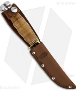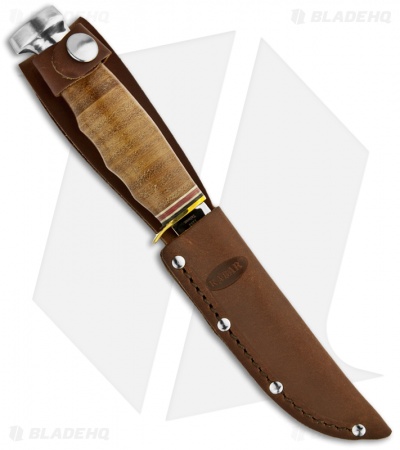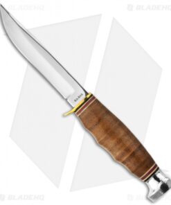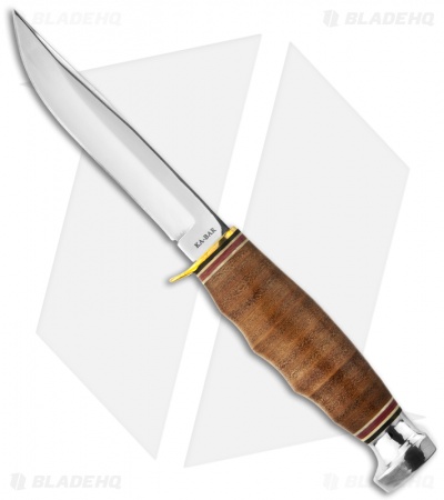The Ka-Bar 1232 Hunter fixed blade is part of Ka-Bar’s classically styled Leather Handled knives. It features a polished stainless steel blade with hollow grinds and a notched thumb ramp. The brass guard and stacked leather handle are complemented by colored spacers and an aluminum pommel. Includes a brown leather KA-BAR sheath.