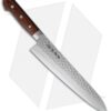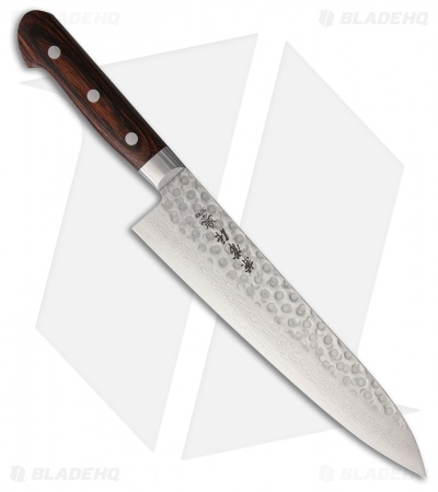 The Gyutou Chef’s knife by Kanetsune features a 8.5″ blade made of hammered stainless steel VG-10 for an attractive and durable finish. VG-10 takes an excellent edge, is highly corrosion resistant and easy to maintain, all the qualities you need in a functional kitchen knife. Attractive laminate wood handles are pinned to the full tang blade and allow you to handle the knife right at the cutting edge in safety.