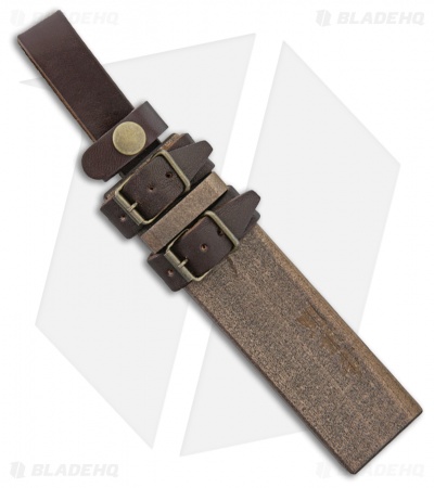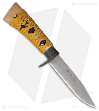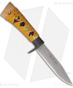 Featuring a 4.75″ 15 layer damascus blade with a Blue Steel core takes an exceptional edge while each knife has a unique damascus pattern. A classic black steel finger guard provides additional safety and is an attractive contasts the the gold Tsukamaki wrapped oak handle. A dark magnolia wood sheath with brown leather straps allows for easy carry or a beautiful display item.
