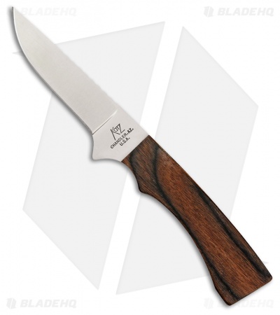 The Katz Knives Kitty Caper fixed blade knife with a full tang walnut handle, forward finger groove and spine jimping is a perfect bird and trout knife. Made with XT-80 stainless steel, the 2.25″ blade easily processes small game or fish. Functional spine jimping, combined with a forward finger choil ensures a solid grip in hand. Includes black cordura clip sheath for easy carry and storage.