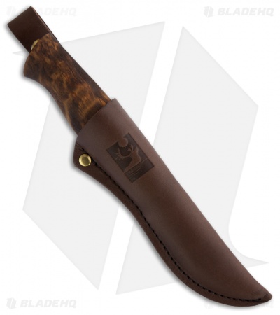 The Falcon is a traditional puukko style fixed blade knife, hand-made in Finland. It features dyed curly birch wood handle with nickel silver bolsters. Full-tang two-tone finished carbon steel blade. Includes a premium leather sheath with belt loop.