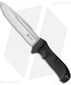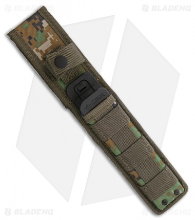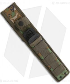 The 5.75″ AUS-8 Japanese stainless steel blade features unique blade geometry for a lightweight blade with an exceptionally strong tip. Black Kraton contoured handles are extremely comfortable and balanced in hand in a variety of positions. The thru-tang design features jimping on the pommel to provide additional traction in reverse grip or can be used as a blunt force tool. Included is a MOLLE compatible multi-cam nylon sheath with a secure locking mechanism.