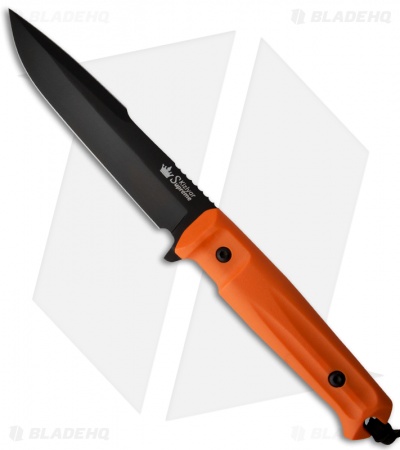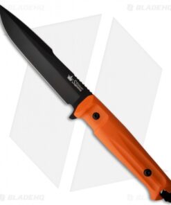 This Kizlyar Supreme Knives Delta has an orange handle and a black AUS-8 harpoon blade.