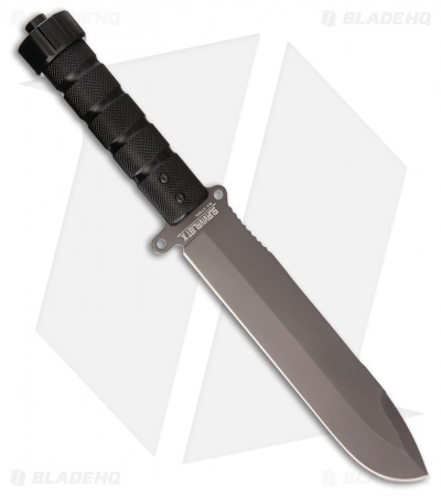 The blade is tough D2 tool steel with a thickness of 5mm, providing you the heft you need for larger chopping tasks. The gray TiNi finish has been laser engraved with a ruler and includes a specially designed spine bevel for breaking tough materials like bone. A highly textured black hollow handle offers excellent traction in hand. Unscrew the pommel of the knife to reveal a hollow compartment with a basic survival kit that can be tailored to your needs. With a full MOLLE compatible ballistic nylon sheath, you can select multiple carry options to keep your Survivalist X close at hand.