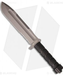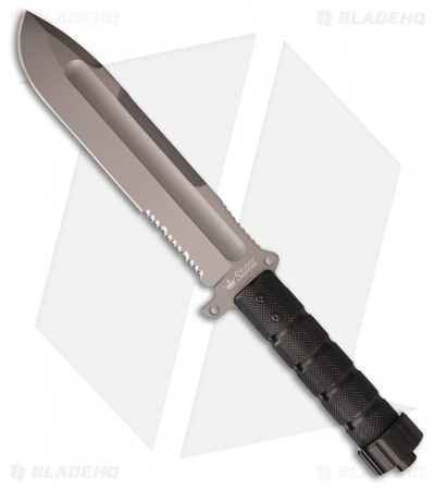 The blade is tough AUS-8 stainless steel with a thickness of 5mm, providing you the heft you need for larger chopping tasks. The gray TiNi finish has been laser engraved with a ruler and includes a specially designed spine bevel for breaking tough materials like bone. Large fullers reduce weight and improve balance while the aggressive serrated edge makes short work of straps, webbing and cordage. A highly textured black hollow handle offers excellent traction in hand. Unscrew the pommel of the knife to reveal a hollow compartment with a basic survival kit that can be tailored to your needs. With a full MOLLE compatible ballistic nylon sheath, you can select multiple carry options to keep your Survivalist X close at hand.