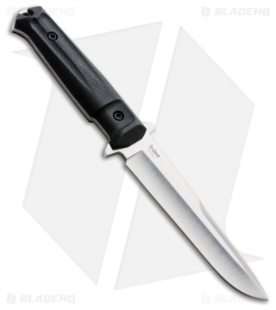 Made from tough D2 tool steel, the Trident features a precision hollow ground blade and sharpened spine swedge for extra versatility. Dual finger guards not only protect you from your exposed edge but potential attacks from similar tools. Black Kraton handle scales provide excellent traction and control while remaining comfortable for less fatigue. The integrated pommel glass breaker can double as a blunt force tool. Includes camo ballistic nylon MOLLE compatible sheath for easy carry in the field.