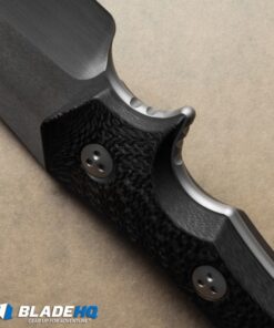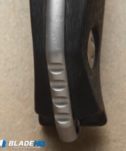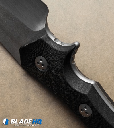 The Apex fixed blade is the second father/son collaboration from Marfione Custom Knives. It has a wide profile, hand ground Elmax steel spear point blade with a hand satin finish. The upper grind is partly sharpened. Fastened to the handle are 3D milled carbon fiber scales, which are offset by the rounded crown full-tang. Date, serial number, makers (Anthony Marfione / Sean Marfione), and the Dagger logo are marked on the blade.