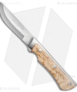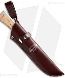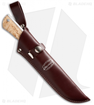 Craftsmanship is evident in this sturdy knife from Marttiini. The robust blade is made of chromed stainless steel. The full tang construction will hold up to years of heavy duty use. The handle features beautiful curly birch inserts and has a very comfortable grip, even for bigger tasks associated with hunting and camping. This knife comes with a burgundy leather sheath with attached belt loop and secure snap closure.