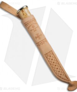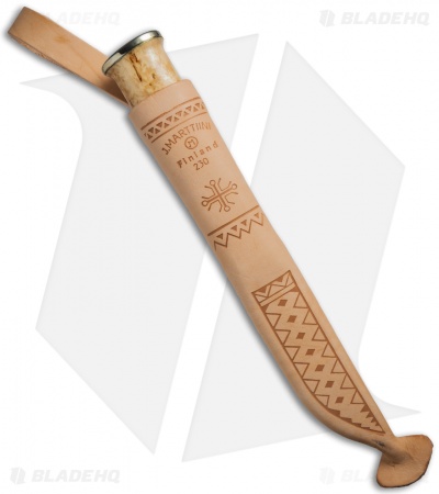 A popular hiking and all purpose knife, the Marttiini Lapinleuku 230 knife is as beautiful as it is functional. This handsome knife has mirror finish stainless steel blade with a Lappish-themed scene etched into the front along with the Marttiini signature and knife name. A traditional Lapp design is also etched into the stiff leather sheath. The handle is made of polished curly birch that has a rich hue and a comfortable feel in the hand. The bolster is made from satin finished brass and the pommel is polished brass. The sheath has a secure snap closure and attached belt loop.