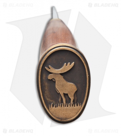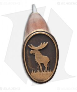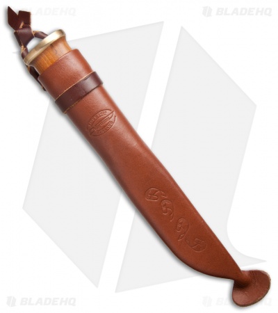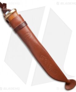 The king of the Finnish woods, the Moose, is represented in this handsome knife. The standard blade is made of Carbinox T508 and has a flat grind and a polished finish. The bolster and pommel are both made of bronze, and the pommel has a casting of a regal moose. Made of birch wood, the polished handle has a warm look and a good feel in the hand. The knife comes in a brown leather sheath embossed with the Marttiini logo.