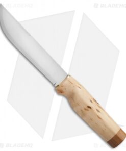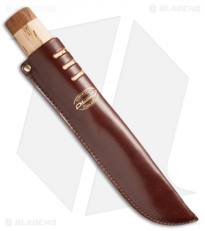 A strong, impressive knife based on designs of Lapp knifes made hundreds of years ago, the Ranger 250 knife is the largest of its kind from Marttiini. The 6.25″, 420 stainless steel blade has a mirror finish and is etched with elements representing Finland. The curly birch handle is beautiful to look at, and is nicely contoured to fit your hand comfortably. The knife comes with a russet colored leather sheath with attached belt loop and brass findings.