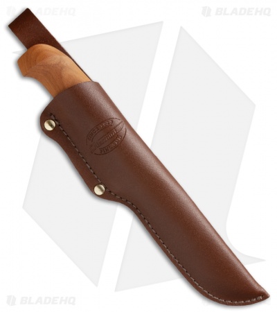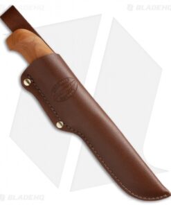 The Miarttiini Utility Knife is similar to their Lynx 134 knife, but with some practical differences. The stainless steel INOX standard blade is satin finished and slightly longer than the Lynx. The finger guard is ridged and made of satin finished nickel silver. The birch wood handle is smooth and gently contoured, so the feel in your hand is comfortable and secure. The Utility knife comes with a leather sheath with brass fittings. It’s a lightweight, multipurpose tool, just like the name implies.