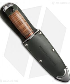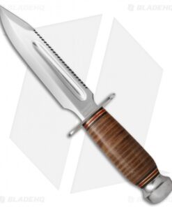 This beautiful classic Air Force fixed blade is a standout knife with its mirror polished blade. It features a sharpened clip point, saw back spine, and stamped ricasso (“Aeronautica Militare”). The handle is stacked leather with guard and polished aluminum pommel. Includes a green leather sheath.