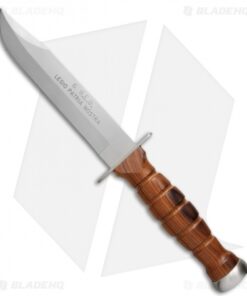 The French Foreign Legion is a classic fighting knife design that is famous for its use in wars past. This model has a grooved wood handle with a double guard and stainless steel pommel cap. Its bead blasted clip point blade is stamped “6 R.E.G. LEGIO PATRIA NOSTRA” on front. A premium leather sheath with sharpening stone is included in pocket.