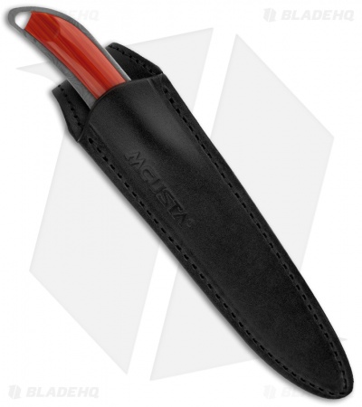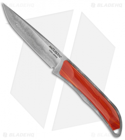 The MC-6 Series is the first fixed blade from Mcusta. It is a featherweight, slim line all-purpose utility knife suitable for trout and bird hunters. The blade and handle are one-piece construction of VG-10 core forged with 33 layered nickel Damascus stainless steel. The handle is inlaid with spiny oyster slabs. Each knife comes with black leather sheath.