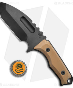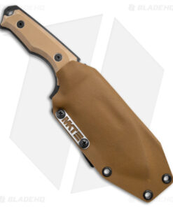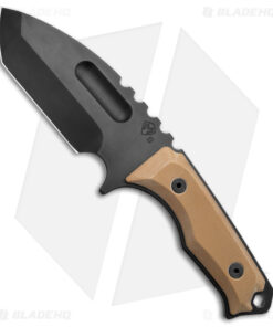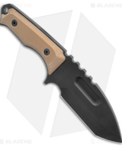 - Coyote brown G-10 handle scales on a meaty full tang.