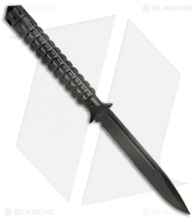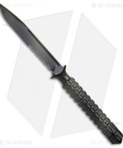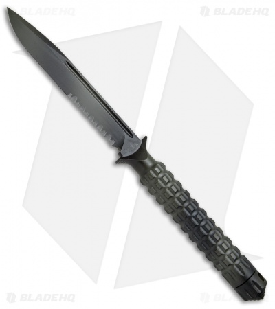 The A.D.O. (Alpha Detachment Operative) is an extraordinary fixed blade knife from Microtech. This ADO features a green camo finished single edge blade (serrated) and handle with a waffle-style texture. This knife follows the design of Chris Reeve fixed blades with a hollow handle, accessed by unscrewing the glass breaker tip. It is made from a solid billet of stainless steel. The A.D.O. includes a composite sheath with a spring loaded tab to secure knife and a 2″ steel clip for belt carry.