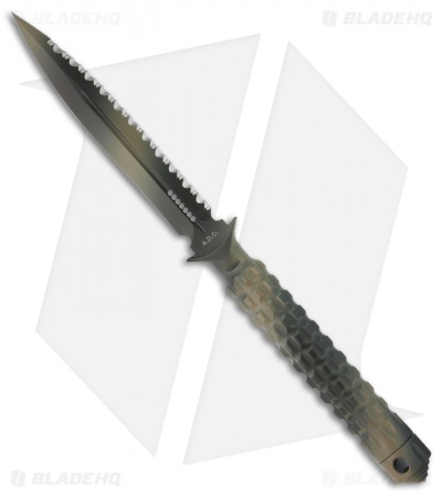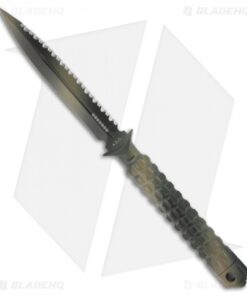 The A.D.O. (Alpha Detachment Operative) is an extraordinary fixed blade knife from Microtech. This ADO features a tan camo finished double-edge dagger blade and handle with a waffle-style texture. The blade is fully serrated on one edge and plain on the other. This knife follows the design of Chris Reeve fixed blades with a hollow handle, accessed by unscrewing the glass breaker tip. It is made from a solid billet of stainless steel. The A.D.O. includes a composite sheath with a spring loaded tab to secure knife and a 2″ steel clip for belt carry.